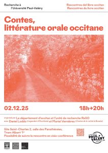 Avec Daniel Loddo (Legendari d’Occitània) et Muriel Vernières (Contes de la val de la Boneta), Organisé par Le département d’occitan et l’unité de recherche ReSO