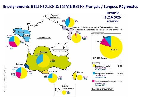 Comme vous pouvez le constater sur cette carte des enseignements bilingues et immersifs, la FLAREP, à travers ses associations et/ou fédérations de parents d’élèves et/ou d’enseignants, représente environ 75 % des effectifs concernés par ces filières.